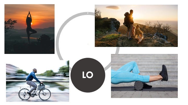 LO = Low Intensity. This circle is for all of our easier exercise: walking, hiking, slow yoga, easy biking, and massage/stretching/tissue work. It’s the biggest circle, so you get to do the most of it. The key to ‘LO’ training is recovery. You are keeping your heart rate low, focusing on caring for your body and promoting adaptation from harder training days. ‘LO’ training allows you to build resilience in your tissue so that the ‘HI’ training days don’t blow up your body. Most of us aren’t training for a race in 3 weeks. We are training to live well for the next 40+ years. We are training to have fun.